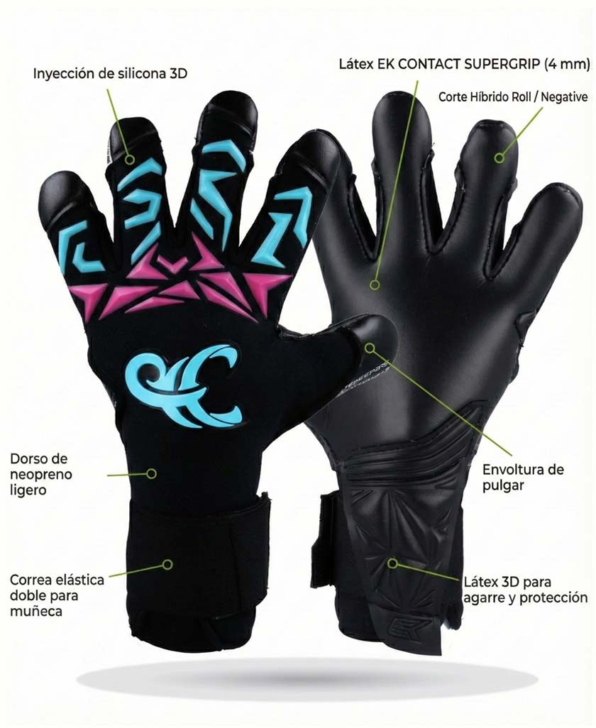 The palm features the pro-grade “EK CONTACT SUPERGRIP HIGUITA” latex in 4 mm, engineered for maximum grip and excellent ball sensitivity. It supports natural hand movement and provides secure handling on every catch.