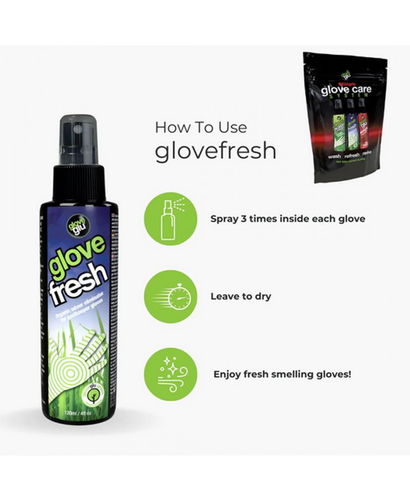 Glovefresh (120ml): Gracias a este producto, mantendrás tus guantes con un olor fresco y sin olor gracias a la exclusiva fórmula antibacteriana. A diferencia de un aerosol a base de perfume que simplemente enmascara un olor, Glovefresh actúa directamente sobre las bacterias que producen el olor, eliminándolas junto con el olor desagradable.