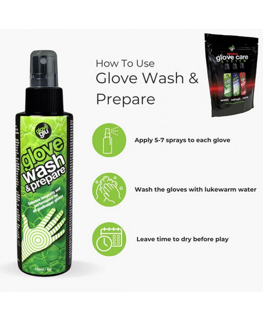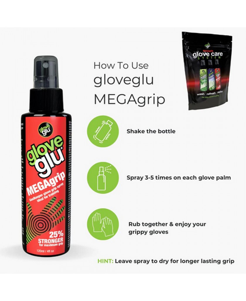 Set Glove Glu MEGAgrip Glove Care System que incluye el spray Premium Glove Wash & Prepare (120ml) + Glovefresh (120ml) + guanteglu MEGAgrip (120ml).