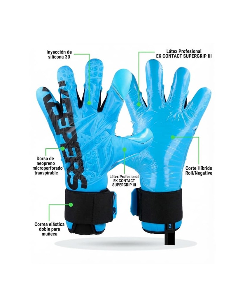 La palma monta nuestro EK CONTACT SUPERGRIP III de 4 mm, un látex de nivel profesional diseñado para ofrecer confianza en blocajes, desvíos y acciones de reacción.